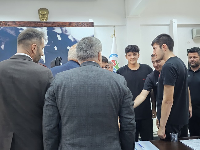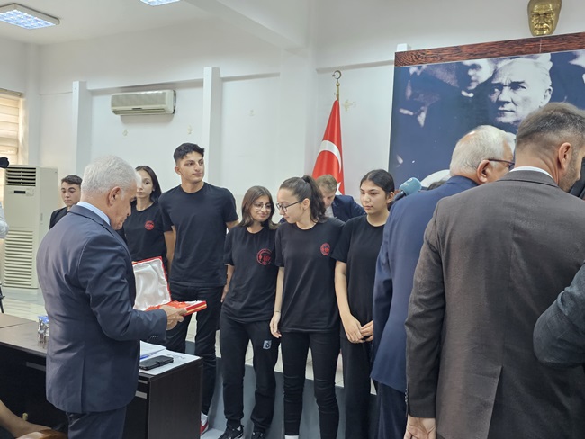 Kürsüye davet edilen sporcular ve teknik heyete altınlarını Belediye Başkanı Halil Posbıyık ve siyasi partilerin grup temsilcileri takdim etti.