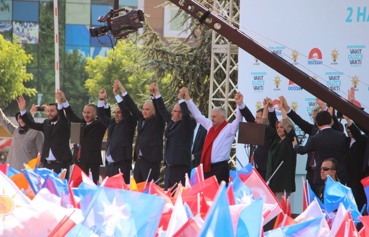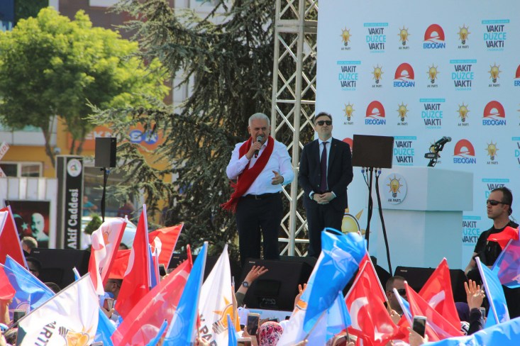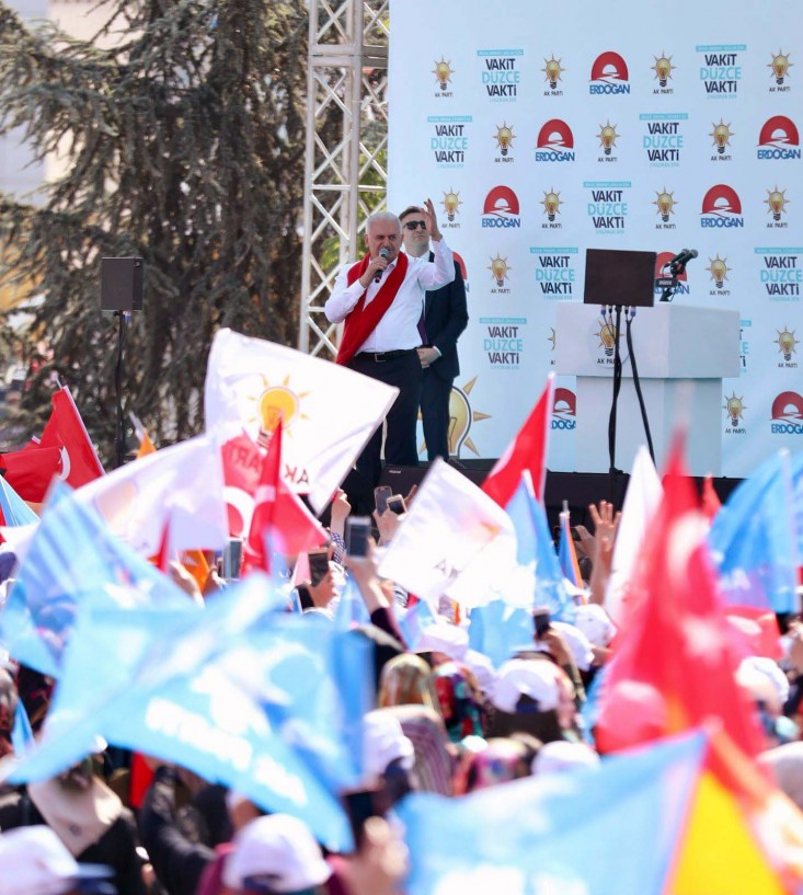 Mitinge konuşan Başbakan Binali Yıldırım, "Gölcük Yalova depremlerini yaşadık. O zaman iktidarda olanlar depremin altında kaldılar. Van depreminde Türkiye ayaktaydı, Cumhurbaşkanımız, Başbakanımız, bakanları ile birlikte 4 saat içinde Van'daydık. Biz taş üstüne taş koyan iktidarız. AK Parti döneminde kendi tankını, kendi topunu, helikopterini yapar hale geldi. Bugünlerde petrol aramaları için Fatih gemisi 'Vira Bismillah' diyerek Akdeniz'e açıldı. Bugün çocuklarımız tabletler ile bilişimin gerektirdiği her türlü teknolojiyi kullanarak eğitim alıyor. 8. sınıfta bir milyon öğrencimiz ter döktü, geleceğimiz için zorlu bir sınavdan geçti, bütün çocuklarımıza Allah zihin açıklığı versin. Türkiye'nin şehirlerini birbirlerine bölünmüş yollarla bağladık. Türkiye'nin doğusu ile batısını birleştirdik. Yolları böleriz ama Türkiye'yi böldürtmeyiz" dedi.