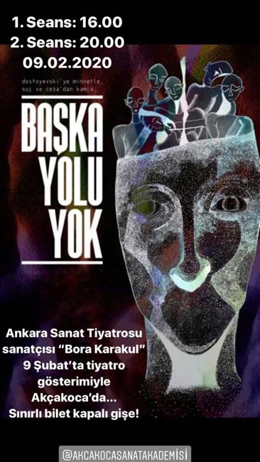 “Bora Karakul” un sergileyeceği “Başka Yolu Yok”, Akçakoca Sanat Akademisi Derneği’nde saat 16.00 ve 20.00 olmak üzere 2 seans olarak sahnelenecek.
