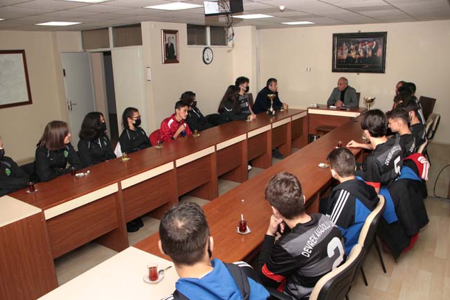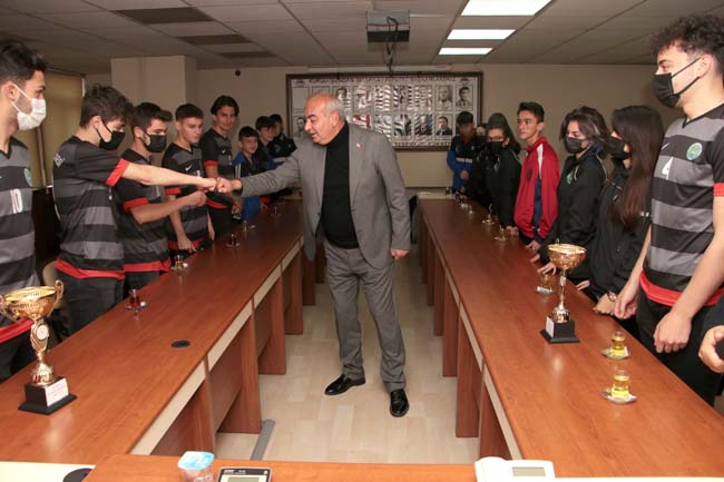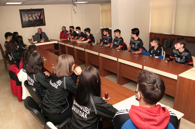 Okul Müdürü Siyami Akpınar öncülüğünde, Başkan Bozkurt'u ziyaret eden Futbol ve Kros takımı oyuncuları, Liselerarası Futbol Müsabakalarında il birinciliği ile