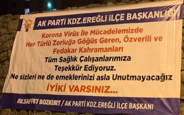Ak Partı Ereğli İlçe Başkanı Saffet Bozkurt sağlık çalışanlarını unutmadı. Bozkurt Korona Virüs salgını nedeniyle ilk günden bu yana mücadele veren sağlık çalışanlarına motive amaçlı hastane girişine pankart astı. Hastane girişimine asılan pankartta şu ifadeler yer aldı;