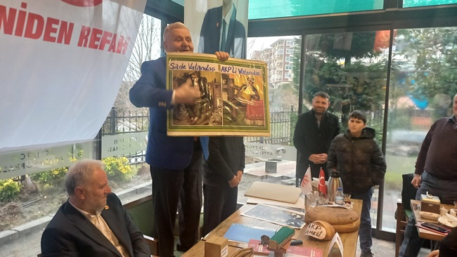 Yeniden Refah Partisi Genel Başkan Danışmanı Mehmet Aras, bir sandalyenin üzere çıkarak ve yanında getirdiği görsellerle destekleyerek, mikrofon kullanmadan yaptığı konuşmada insanların, üç yerde hesap verdiğini söyledi.