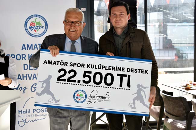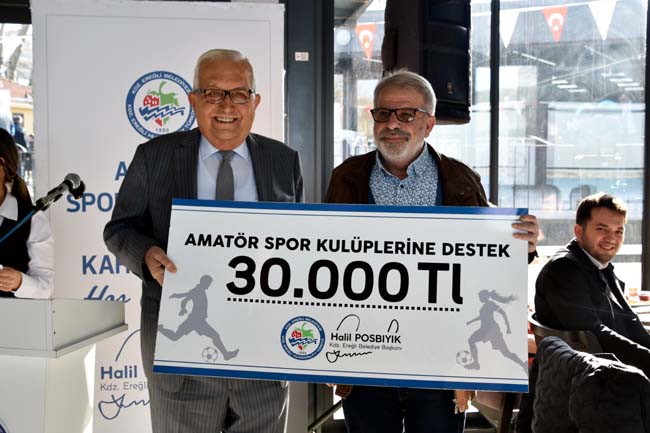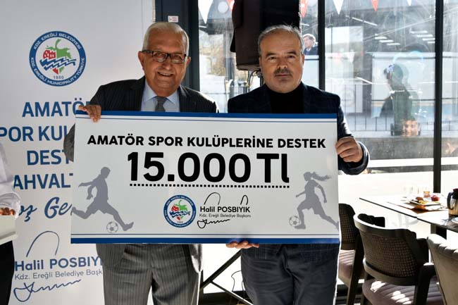 Kdz. Ereğli Belediye ve Belediyespor Kulüp Başkanı Halil Posbıyık, kentteki amatör spor kulüplerinin başkan ve yöneticileriyle bir araya gelerek 17 kulübe 375 bin TL nakdi yardımda bulundu. Erdemir’in özelleştikten sonra kulüpleri kapatmasıyla Ereğli gençliğinin ortada kaldığını belirten Başkan Posbıyık; “Gençlerimize biz sahip çıkıyoruz. Belediyespor bünyesinde 12 branş kurarak bin sporcumuzu destekliyoruz. Ereğli’den ilk 500’e giren 3 firma Ereğli gençliğine tek kuruş harcamıyor. Ereğli’nin sporcu alt yapısı çok iyi olmasına rağmen devlet imkanları en geride ilçeyiz. Bugün amatör sporun yükünü çeken kulüp başkanları ve yönetimine destek için 17 kulübümüze 375 bin TL nakdi yardımda bulunuyoruz” dedi. ASKF Başkanı Kemal Demir, Başkan Posbıyık’a amatör spor kulüpleri adına teşekkür etti.