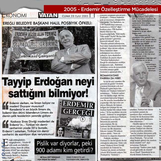 Yine 2005‘yılının son aylarında özelleştirme yine gündeme geldi. Özelleştirmenin olmaması için Belediye meclis üyeleri ve ekibimizle elimizden geleni yaptık. Sesini gür bi şekilde yükselten, bir tek Kdz. Ereğli Belediye Başkanı Halil Posbıyık’tı. Mücadele etti. Ama; Erdemir’i dönemin Maliye Bakanının da dediği gibi ‘Babalar gibi sattılar’. 2006’da Yerli kuruluşumuz Oyak aldı diye, bir nebze olsun memnun olduk. ‘Yabancıya satılmadı’ dedik.