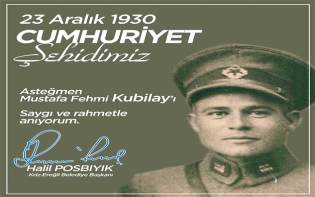 Kdz Ereğli Belediye Başkanı Halil Posbıyık, Devrim Şehidi Asteğmen Mustafa Fehmi Kubilay'ı sosyal medya hesabından yayınladığı mesajla andı.