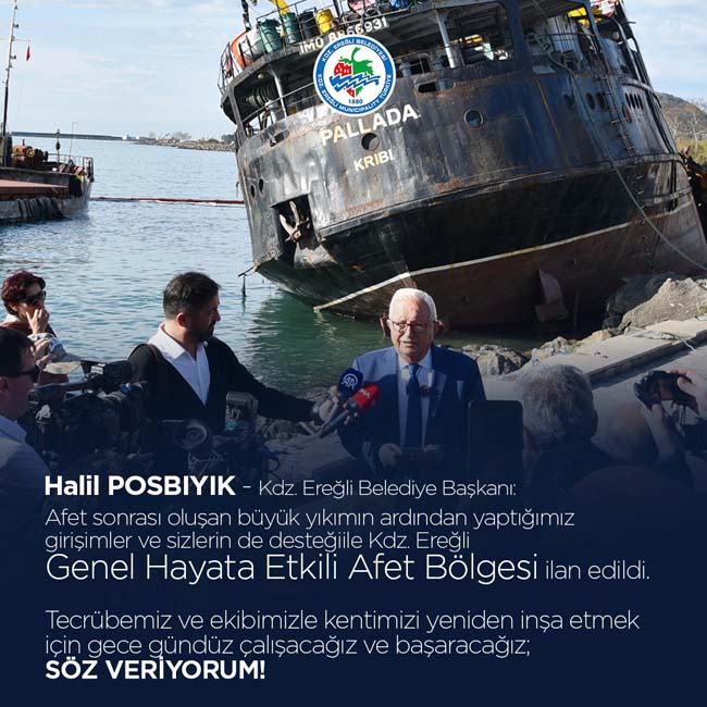 Kdz.Ereğli Belediye Başkanı Halil Posbıyık, Ereğli'nin 19 Kasım’da yaşanan sel ve afetin ardından Genel Hayata Etkili Afet Bölgesi ilan edilmesiyle ilgili sosyal medya mesajı yayımlayarak; “SÖZ VERİYORUM!” dedi.