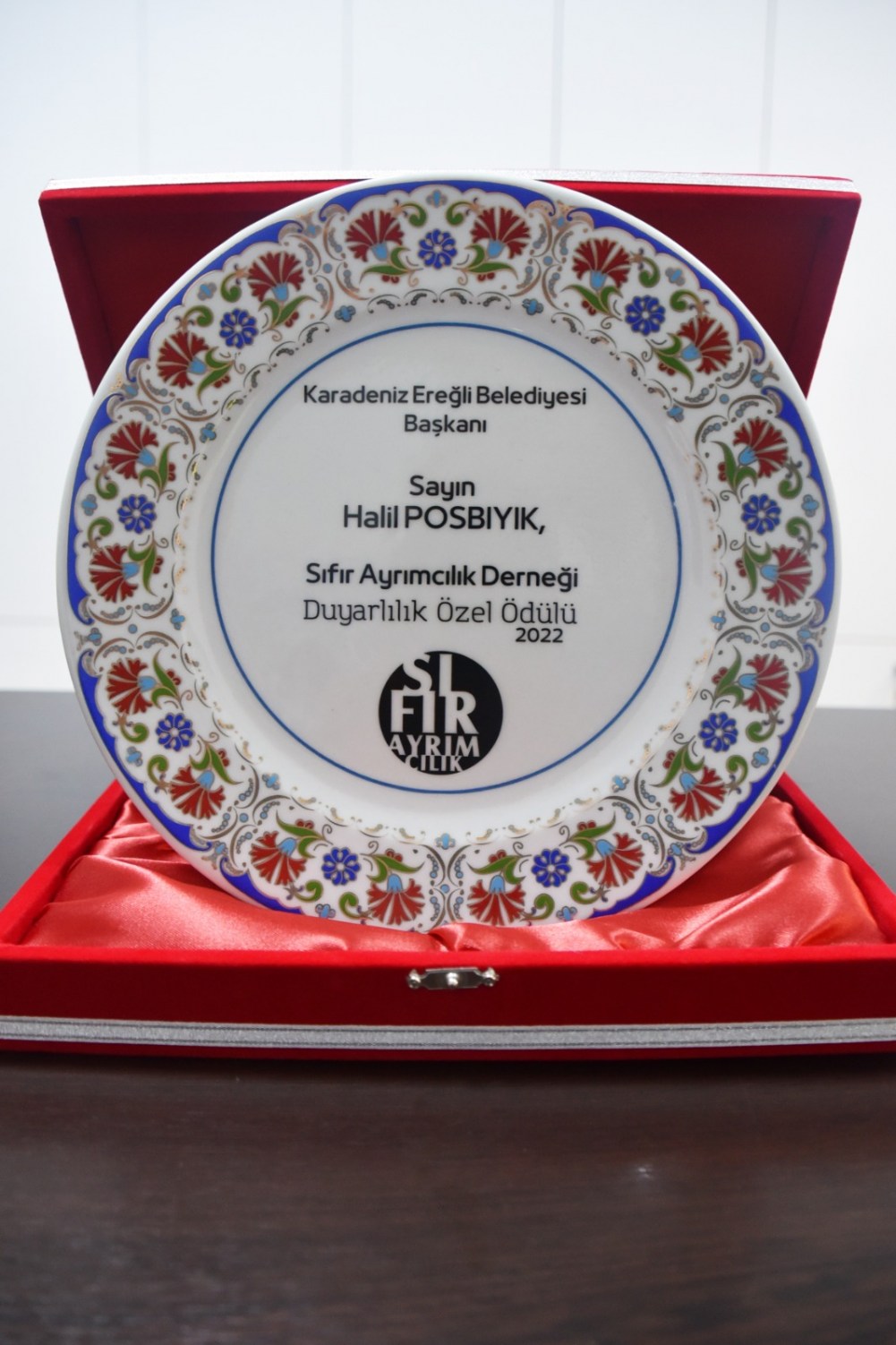 Başkan Halil Posbıyık’ın İstanbul’da düzenlenen ödül törenine yoğun işleri nedeniyle katılamaması nedeniyle ödülü Sıfır Ayrımcılık Derneği Yönetim Kurulu Başkanı Elmas Arus tarafından Kdz. Ereğli Belediyesi’ne ulaştırıldı.