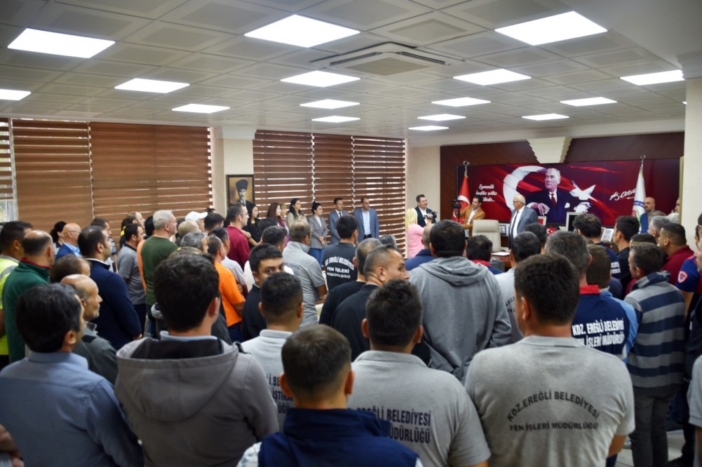 Bunun karşılığında el ele verip daha fazla çalışmamız lazım. Bizim yaptığımız bu görevin karşılığında sizin de bize yardımcı olmanız lazım. 8 saat Ereğli halkına en iyi hizmeti vermemiz lazım. Bizim patronumuz Ereğli halkı. Benim sizlerden beklediğim tek şey bu. Her şeyden önce sağlıklı ve sıhhatli olmanızı diliyorum. Eşinizle, çocuğunuzla birlikte mutlu olmanızı istiyorum. İnşallah daha iyi günler gelecek.