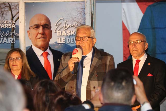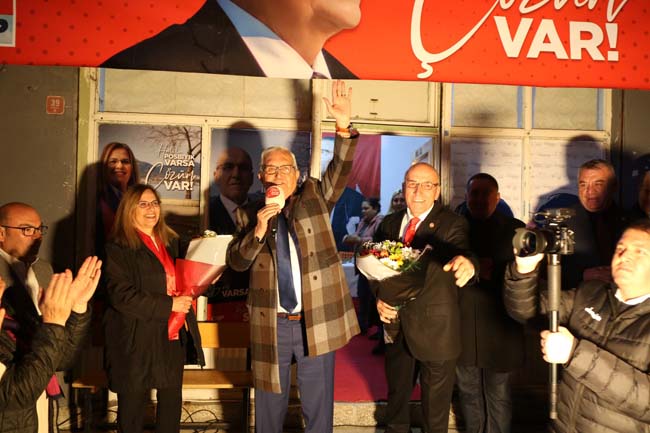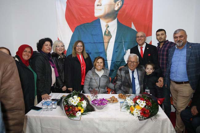 Başkan Posbıyık’a açıklamalarının ardından Kestaneci Mahallesi’nden sorumlu belediye meclis üyesi adayları Gönül Çelik ve Bayram Seçen tarafından çiçek takdim edildi.