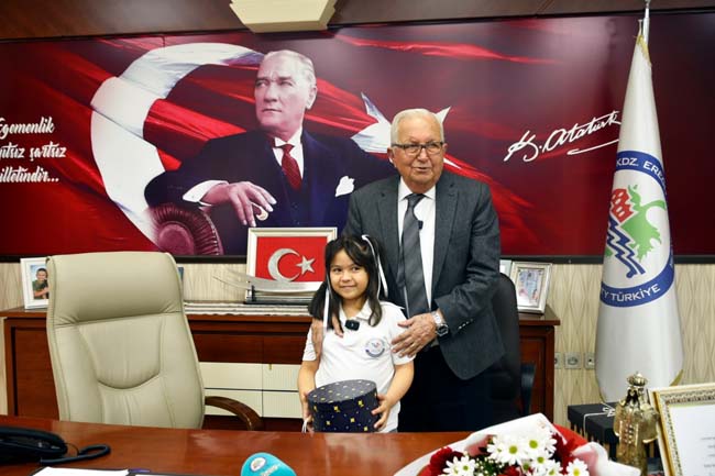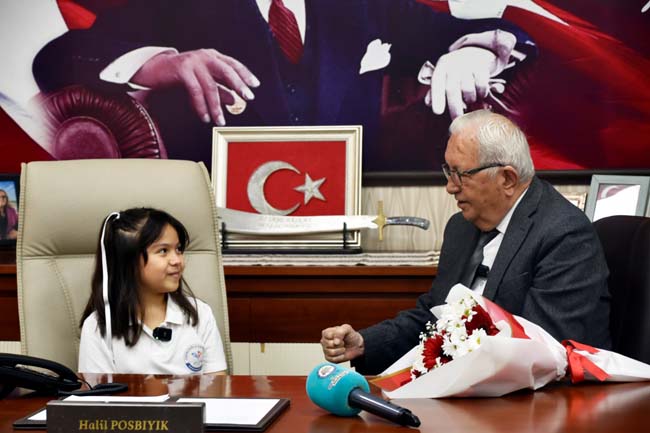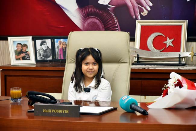 Başkan Halil Posbıyık, 23 Nisan Ulusal Egemenlik ve Çocuk Bayramı nedeniyle koltuğunu İzmirlioğlu İlkokulu 2. sınıf öğrencisi Aden Su Cebir’e devretti.
