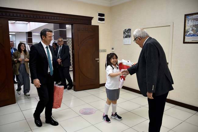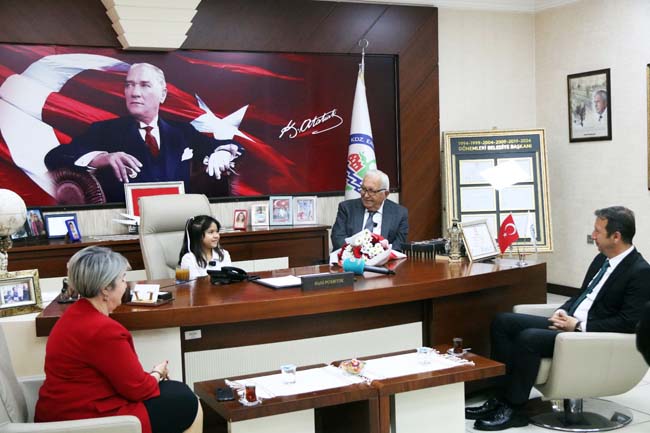 Okul Müdürü Cem Akbaş ve sınıf öğretmeni Figen Özcan ile birlikte başkan yardımcıları tarafından makamda karşılanan Aden Su Cebir, Başkan Posbıyık’a çiçek takdiminde bulundu. Koltuğa oturan Cebir, tüm çocukların Ulusal Egemenlik ve Çocuk Bayramı’nı kutladı.