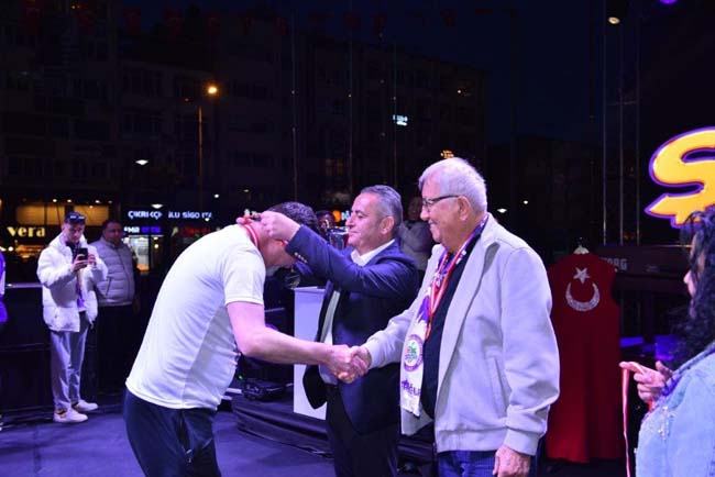 Bu futbol takımına bir sözüm vardı. Eğer siz şampiyonluğu alın konser düzenleyeceğim ve sizi halkın önüne çıkaracağım dedim. Sizi alkışlattıracağım dedim. Şimdi bu sözümü tutuyorum ve Ereğli olarak bu takımı hep birlikte alkışlıyoruz.