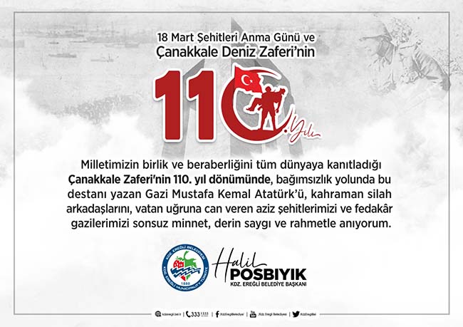 Kdz. Ereğli Belediye Başkanı Halil Posbıyık, 18 Mart Şehitleri Anma Günü ve Çanakkale Deniz Zaferi’nin 110. Yıldönümünde anma mesajı yayımladı.