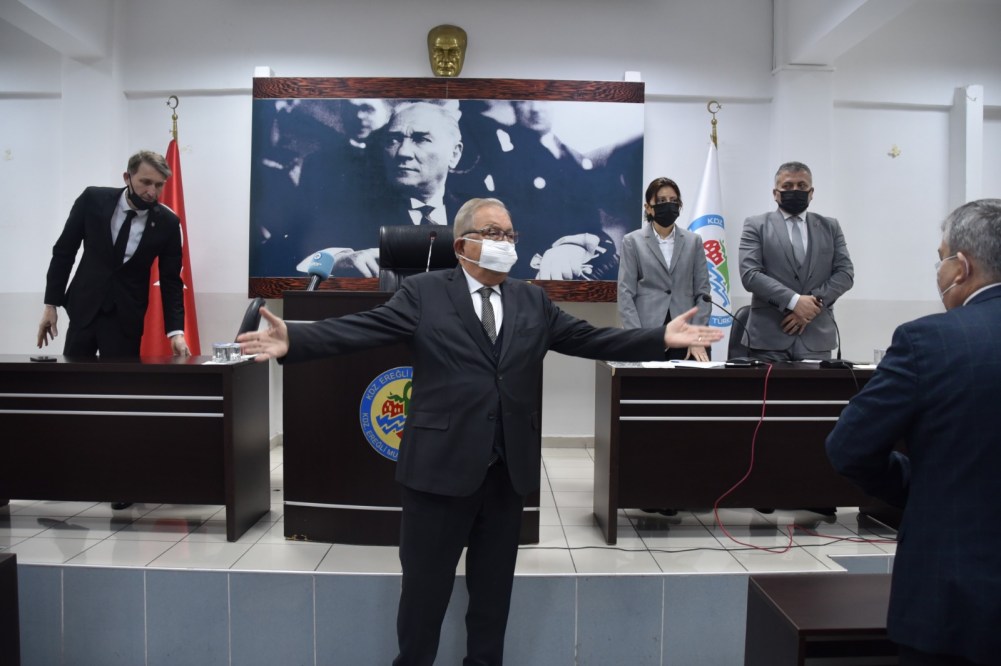 Kdz. Ereğli Belediye Başkanı Halil Posbıyık, Mart ayı meclis toplantısında önemli açıklamalarda bulundu. ‘Savaşa hayır, Barışa Evet’ diyen Başkan Posbıyık, siyasi parti ilçe başkanlarına ve STK’lara Kdz. Ereğli için birlik ve beraberlik çağrısı yaptı. ‘Öncülüğü iktidar partisi İlçe Başkanı Saffet Bozkurt yapsın’ diyen Başkan Posbıyık, “Ukrayna savaşta yanıyor, milletimiz zam ve enflasyonla yanıyor. Halkımız için bir araya gelmemiz lazım. Bütün siyasi parti ilçe başkanlarından yaş itibarıyla daha büyüğüm. Onların ağabeyleriyim. Ama teklif ediyorum, İktidar Partisi İlçe Başkanı arkadaşım Saffet beye çağrı yapıyorum. Bütün siyasi parti ilçe başkanlarını halkın görebileceği bir yerde, kafede, restoranda bir araya getirsin, ben de gelmeye hazırım. Barıştan yana, halkın refahı ve mutluluğu için, işsizliğin önlenebilmesi için, halk yararına fikirlerimizi, düşüncelerimizi yan yana getirmek için hepinizi birlikteliğe davet ediyorum” diye konuştu.