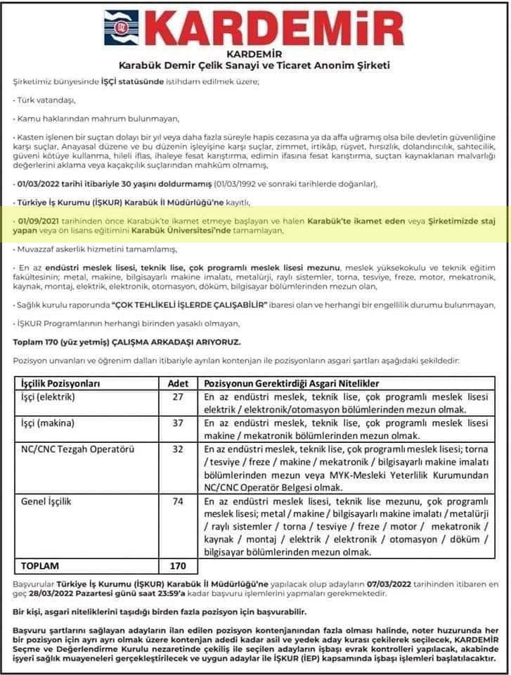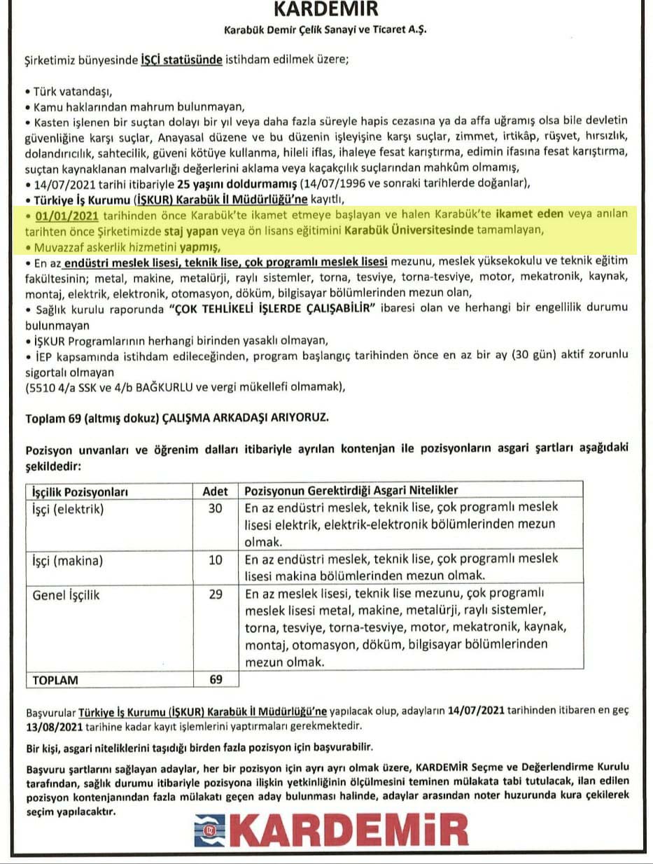 Diğer bir işe alımı ilanında da yine aynı şartlarda 01.01. 2021 tarihinden önce Karabük'te ikamet etmeye başlayan ve hala Karabük'te ikamet eden veya alınan tarihten önce şirketimize staj yapan veya ön lisans eğitimini Karabük Üniversitesi'ne tamamlayan diye bağlıyor. Yani diyor ki Kardemir’e Karabük’lüler girebilir. ancak imtihanlara veyahut da mülakatlara katılabilir diyor. Peki Ereğli’de ne oluyor? Ereğli'ye yüzde otuz bile girmiyor. Yüzde 70 dışarıdan geliyor. Kimse beni yüzde 70 Ereğli’den alınıyor diye kandıramaz. Yüzde otuz bile girmiyor. Torpille, iddialara göre birtakım çıkar meselelerinden dolayı… Ereğlili, Ereğli çocukları ne yapıyor? Ereğli'de yok onlar zaten. Onlar Tuzla’da, Yalova’da, İstanbul’da, Bursa’dalar. Neden Ereğli’ye sahip çıkan yok.
