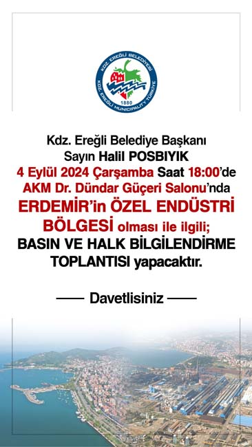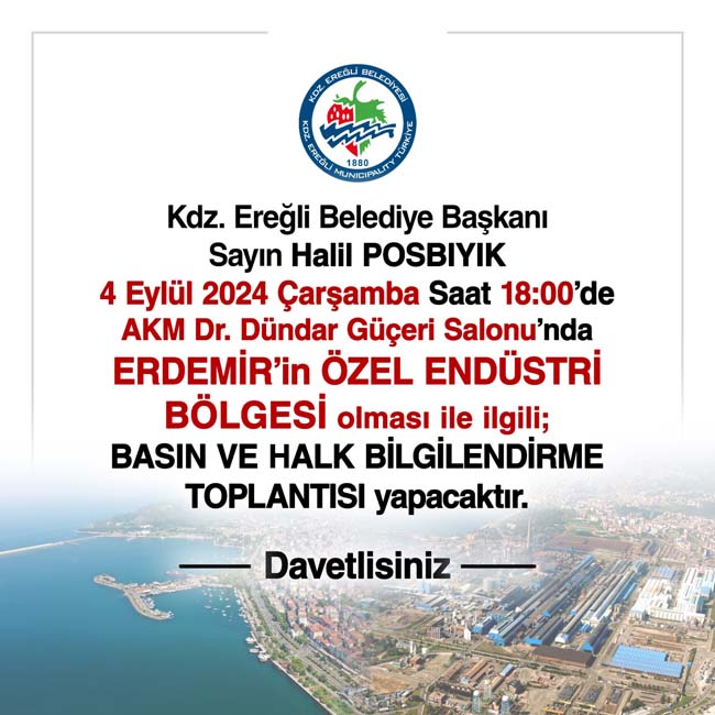Kdz.Ereğli Belediye Başkanı Halil Posbıyık’ın Erdemir’in Özel Endüstri Bölgesi olması nedeniyle basın ve halkı bilgilendirme toplantısı gerçekleştirilecek.