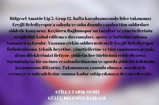 “Bölgesel Amatör Lig 5. Grup 12.hafta karşılaşmasında lider takımımız Ereğli Belediyespor’a sahada ve saha dışında yapılan tüm saldırıları şiddetle kınıyoruz. Keçiören Bağlumspor’un taraftarlar ve yöneticilerinin sergilediği kabul edilemez davranışları, spora ve futbolun ruhuna tamamen aykırıdır. Yaşanan çirkin saldırı nedeniyle Ereğli Belediyespor futbolcularına, teknik heyetine, yöneticilerine ve tüm camiamıza geçmiş olsun dileklerimizi iletiyor, şiddetin her türlüsünü reddediyoruz. Sorumluların biran önce cezalandırılmasını ve sporda şiddetin kökünün kazınmasını diliyoruz. Takımımızın yanında olmaya, ona destek vermeye ve mücadelesine sonuna kadar sahip çıkmaya devam edeceğiz.”