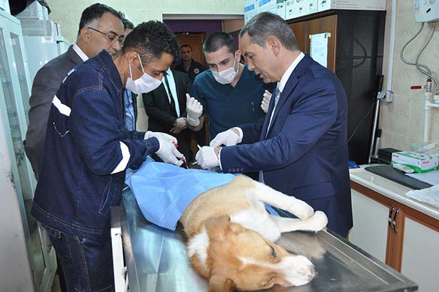 Belediye Başkanı Hüseyin Uysal, Bakım ve Rehabilitasyon Merkezinde veterinerlerin cerrahi müdahalede bulunduğu bir köpeği de ameliyat etti.