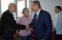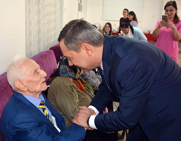 Huzurevi sakinlerini, eşi Sevim Uysal ile birlikte ziyaret etti.