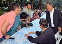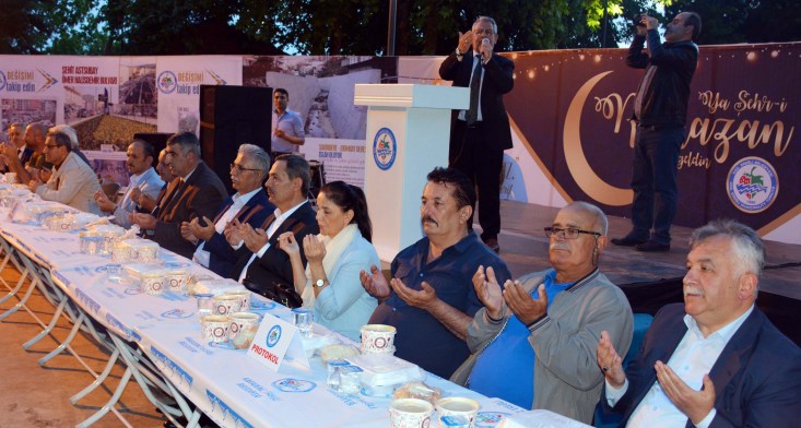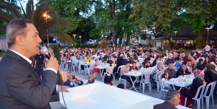 Yenilenen İnönü Parkı'nda gerçekleşen iftar yemeği öncesi Kur'an-ı Kerim ve ilahiler okunurken, Başkan Uysal'da masaları tek tek gezerek halkın Ramazan ayını tebrik etti.