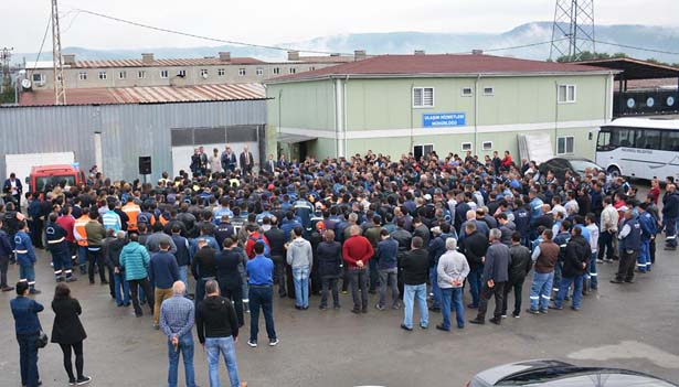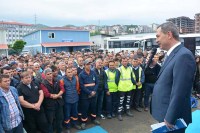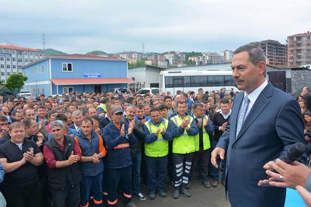 belediye işçileri uzun süre Başkan Uysal'ı alkışladı ve ardından görevlerinin
