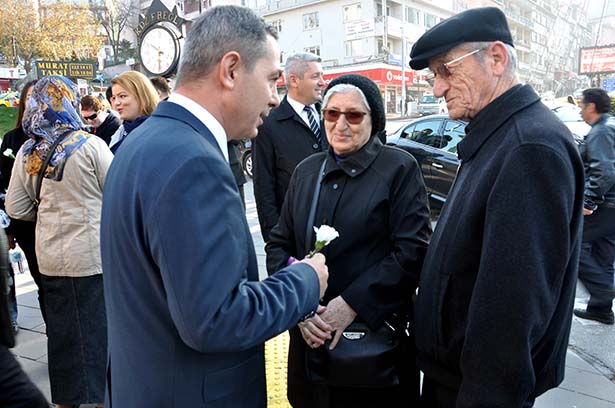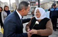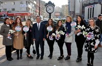 Başkan Hüseyin Uysal, beraberinde Belediye Başkan Yardımcıları, bazı daire müdürleri ile etkinlikleri düzenleyen Kültür ve Sosyal İşler Müdürlüğü personeliyle birlikte şehir merkezindeki cadde ve sokakları dolaşarak, kadınlara beyaz karanfil dağıttı.