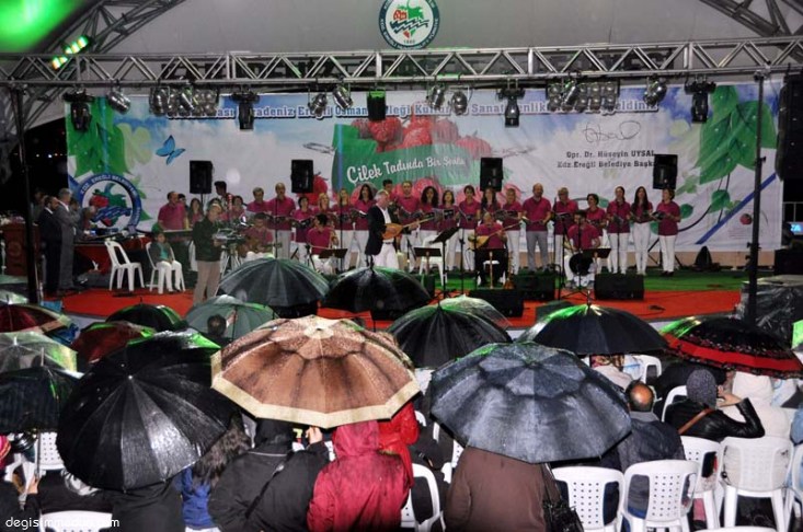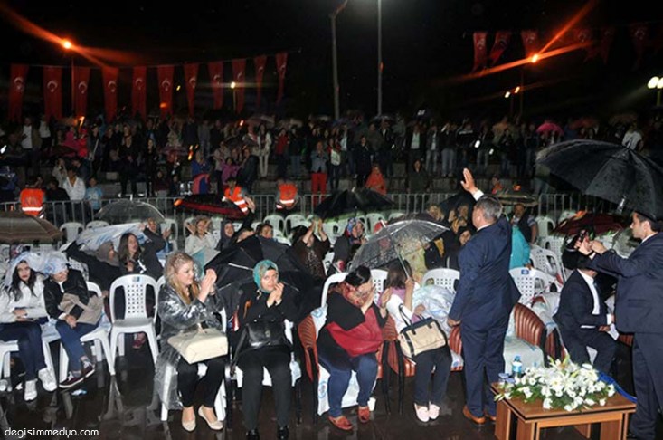Devrim Bulvarı Amfi Tiyatro'da akşam sahne alan yerel Turkuaz Halk Müziği topluluğunun verdiği konseri sağanak yağışa rağmen sanatseverler izlemeye devam etti. Yaklaşık 1 saat süren sağanak yağış nedeniyle vatandaşlar zor anlar yaşasa da şemsiye ve yağmurluklarla kendilerini korumaya çalıştı, Turkuaz Halk Müziği Topluluğunun seslendirdiği eserlere eşlik etti.