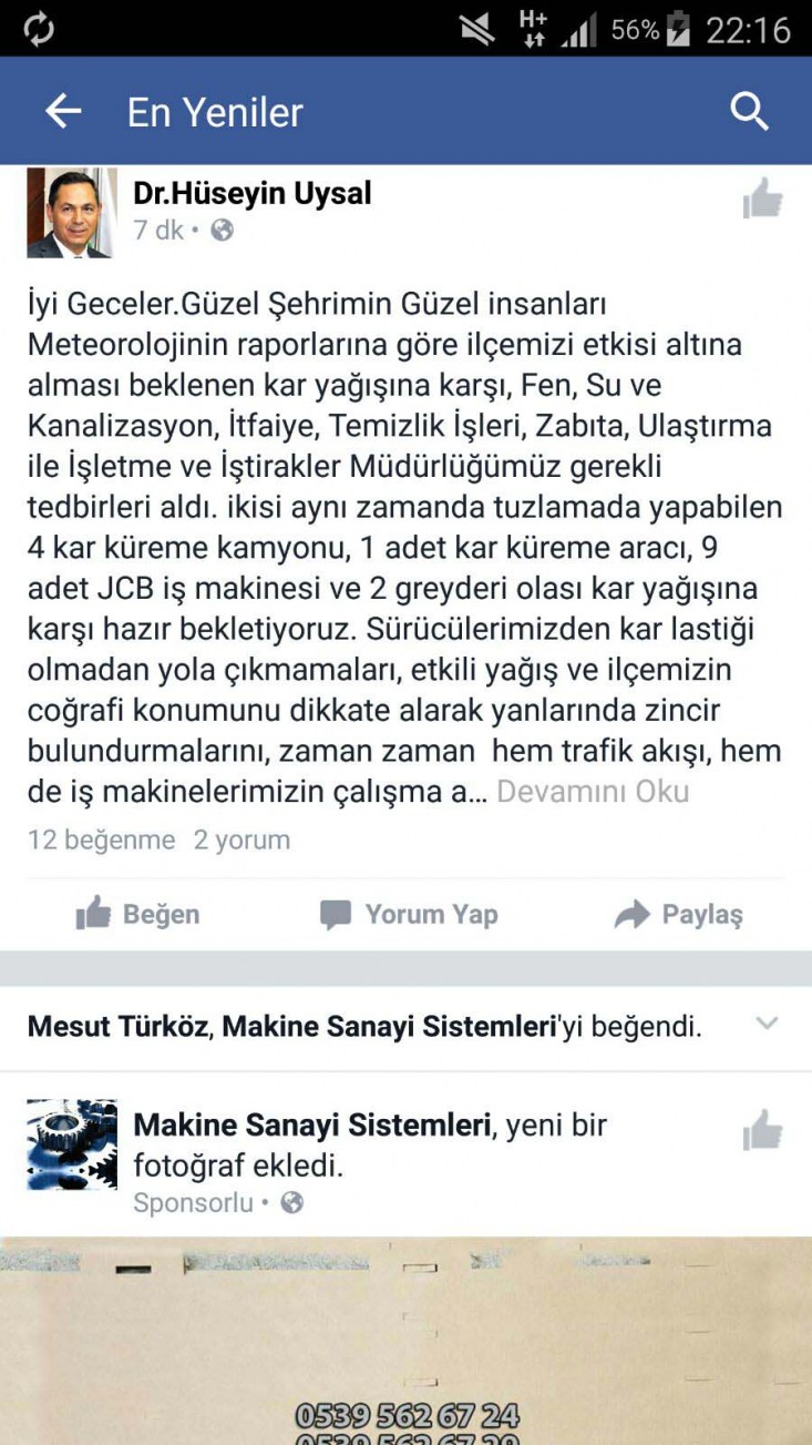 Zonguldak'ın Ereğli ilçe Belediye Başkanı Opr. Dr. Hüseyin Uysal, soğuk hava ve kar yağışına ilişkin sosyal paylaşım sitesinde açıklamalarda bulundu. Uysal Sosyaş paylaşım sitesi üzerinden, Kdz. Ereğli'nin soğuk hava ve kar yağışına ilişkin tüm önlemlerin alındığını duyurdu.