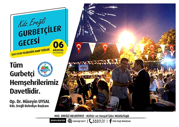 Zonguldak'ın Ereğli ilçe Belediyesi yurt dışında yaşayan gurbetçiler için "Gurbetçiler Gecesi" düzenliyor. Kdz. Ereğli Belediye Başkanı Hüseyin Uysal, bu yıl 3.gerçekleştirilecek olan geceye tüm gurbetçileri davet etti.