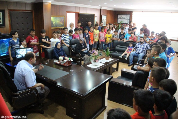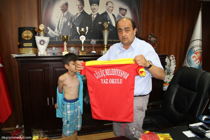 Başkanlık makamında yaz futbol okuluna katılan yaklaşık 100 sporcuyu konuk eden Gülüç Belediye başkanı Gökhan Demirtaş, öğrencilere hitaben yaptığı konuşmasında, başlarında ki hocalarının sözünden çıkmamalarını ve yaz futbol okulunu eksiksiz tamamlamaları halinde kendi elleri ile mangal hazırlayacağını söyledi.