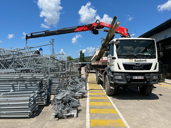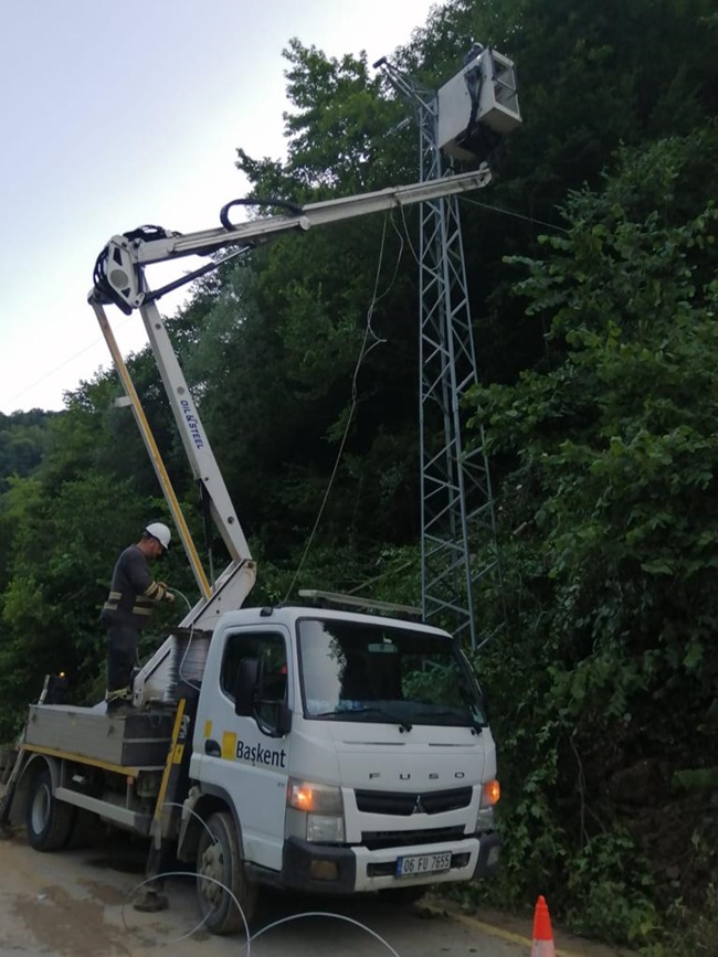 Trafoların güzergâhında heyelandan kapanan bazı yolları kepçelerle açan Başkent EDAŞ ekipleri, hatların üzerine devrilen ağaçları ve selde hasar gören direkleri kaldırmak için vinçleri kullandı.