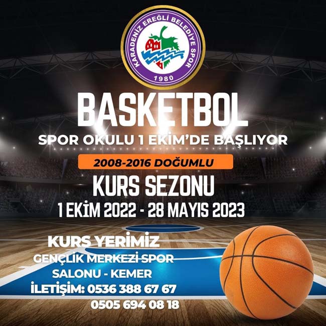 Kdz. Ereğli Belediye Spor Kulübü Basketbol Okulu, branşlarında deneyimli ve kariyerli eğitmenleri ile basketbol sporu yapmak isteyen tüm kursiyerler, kontenjanlar dolmadan kayıt yaptırabilirler.