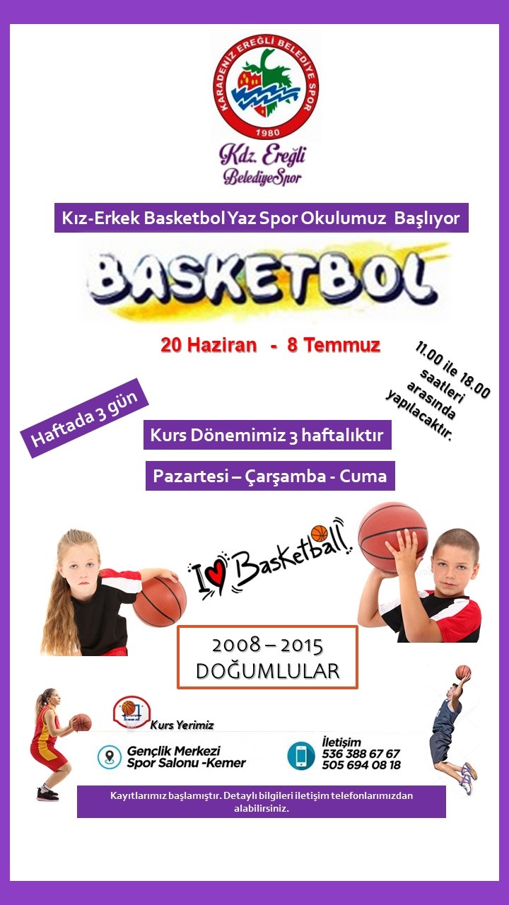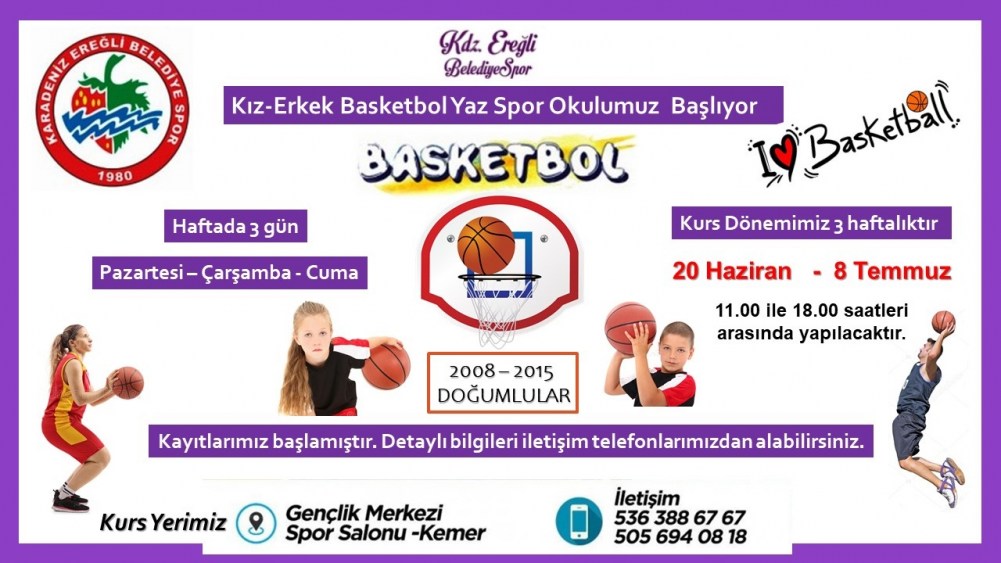 Kdz. Ereğli Belediyespor Kulübü, Kız – Erkek olmak üzere Basketbol Yaz Spor Okulu kurslarını, 20 Haziran Pazartesi başlatıyor.