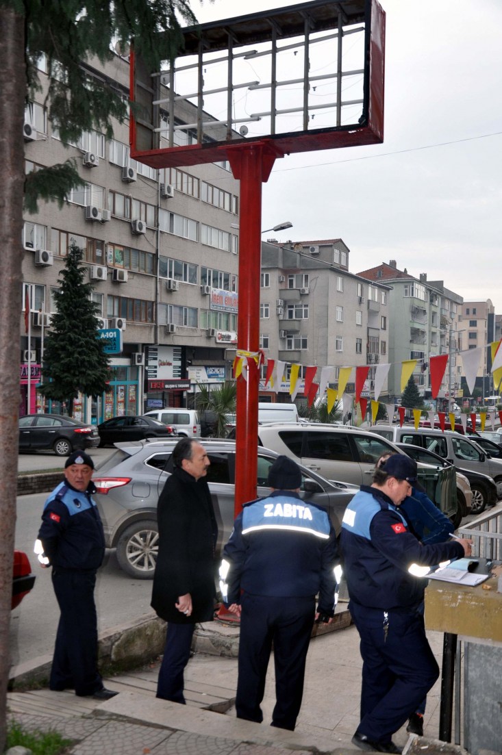 Zabıta Müdürü Alptekin Dursun, gelen şikayetler ve yapılan çalışmalar doğrultusunda bir çok iş yeri tabelasının standartlara uygun olmadığının tespit edildiğini belirterek; "Bir çok iş yeri tabelası standartlara aykırı ve görüntü kirliliği oluşturuyor. Kamuya açık alanda bulunan bazı totemler ile afişlere yönelik bir çalışma başlattık. Öncelikle yaya kaldırımı üzerinde tespit ettiklerimize tebligatlar yapılıyor, tabela yönetmeliğine uygun hale getirecekler. Daha sonra ön cephe tabelalarına yönelik bir çalışma yapacağız ardından standart dışı olanları kaldıracağız. İş yeri sahiplerinin cezai duruma düşmemeleri için reklam tabelalarını yönetmeliklere uygun hale getirmelerini istiyoruz" dedi.