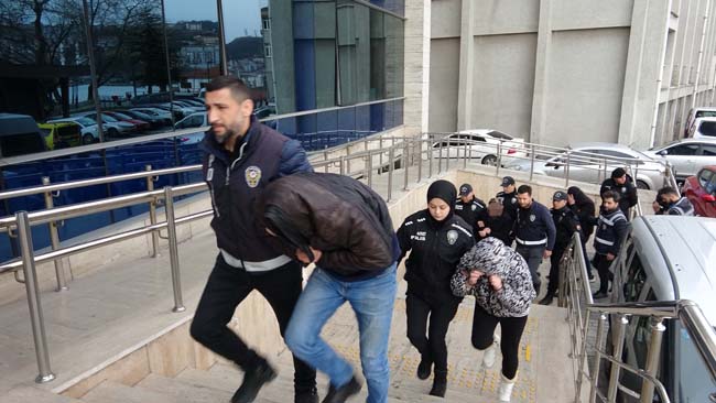 Günübirlik evlerin de kiralama yöntemiyle kullanıldığı tespit edilen soruşturmada fuhşa teşvik eden S.A. (47), Ş.K. (60) ve H.Ç. (42) isimli kadın ile yer temini eden Ş.K. (45), M.B. (22) ve B.E. (21) gözaltına alındı. Emniyetteki işlemleri tamamlanan şüpheliler güvenlik önlemleri altında Zonguldak Adliyesi'ne getirildi. Şüphelilerden 60 yaşındaki Ş.K.'nin elindeki bastonuyla adliyenin merdivenlerini güçlükle çıktığı görüldü.