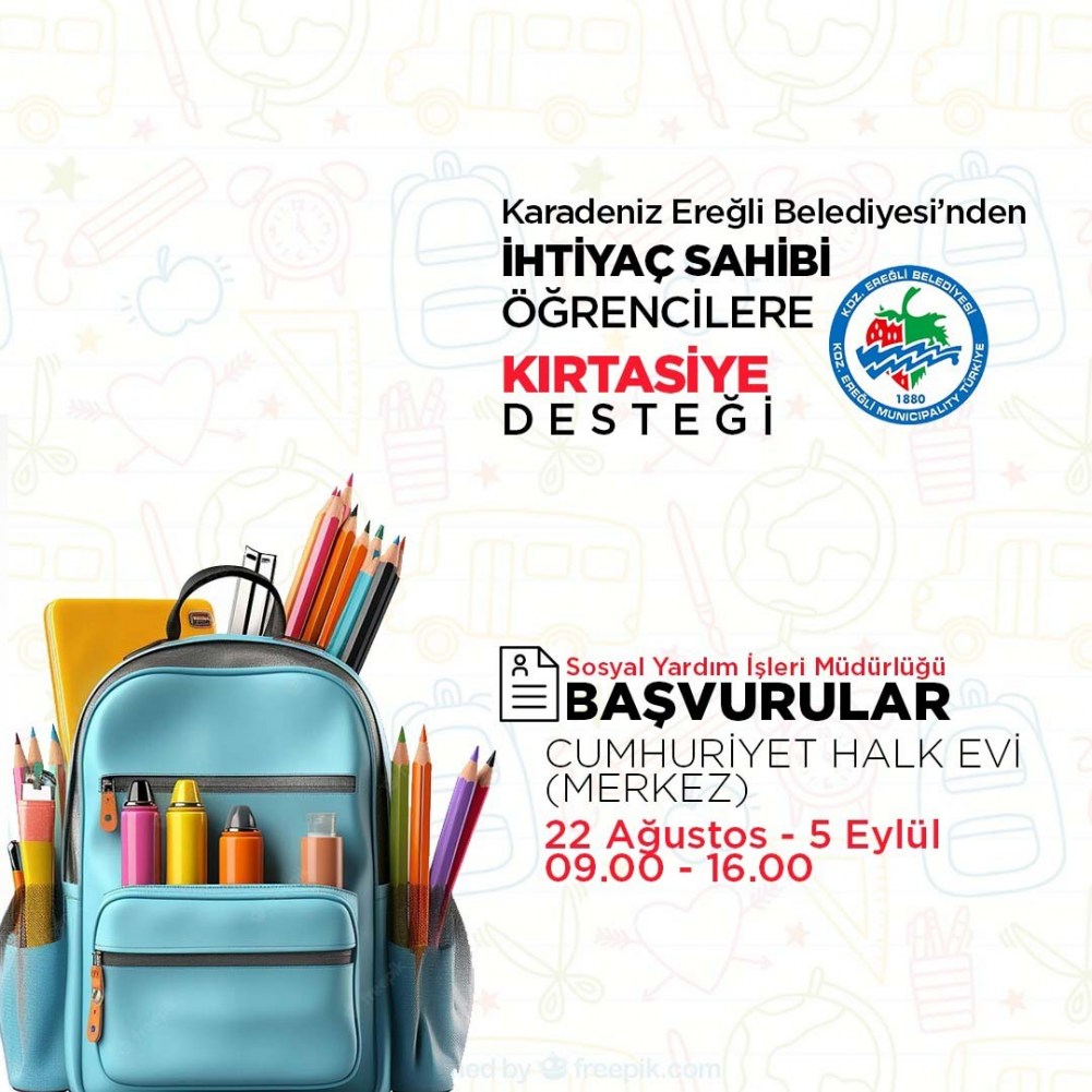 Kdz. Ereğli Belediyesi, 2023-2024 eğitim ve öğretim dönemi öncesinde, ihtiyaç sahibi ailelerin çocuklarına kırtasiye yardımında bulunacak. Başvurular, 22 Ağustos -5 Eylül tarihleri arasında Merkez Cumhuriyet Halk Evi’nde alınacak.
