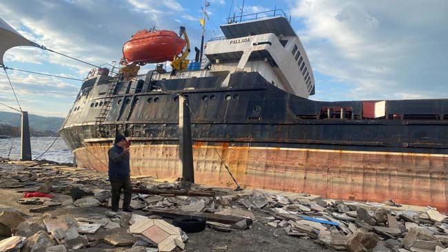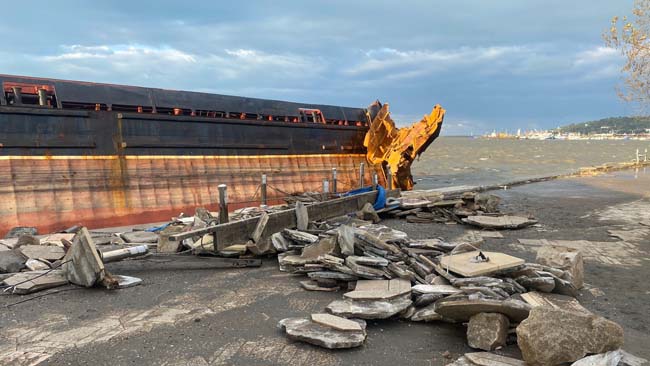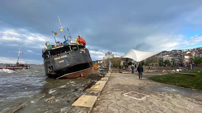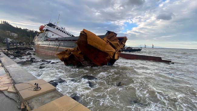 Karaya oturarak ortadan ikiye bölünen Pallada isimli kuru yük gemisi dron ile havadan görüntülendi.