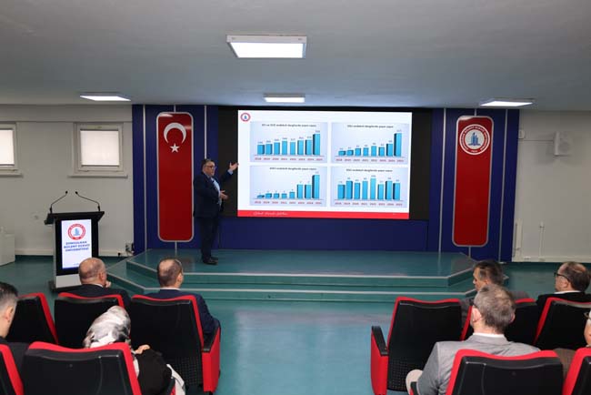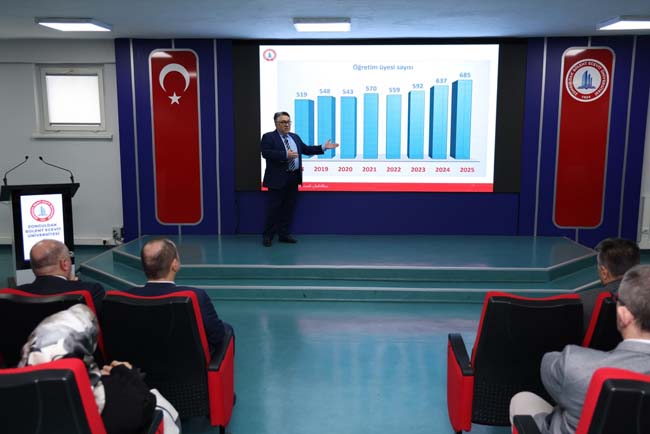 Araştırma-geliştirme faaliyetlerine ilişkin değerlendirmelerde bulunan Rektör Özölçer, öğretim üyesi sayısının 2022’de 559 iken 2025’te 685’e yükseldiğini belirtti. SCI ve SCIE indeksli dergilerde yayın sayısının 317’den 528’e, SSCI indeksli yayınların 48’den 115’e, Scopus yayınlarının ise 471’den 754’e ulaştığını aktaran Özölçer; SCI, SCIE, SSCI ve AHCI kapsamındaki toplam yayın sayısının 2022 yılında 368 iken bu sayının 2025 yılında 625’e yükseldiğini ifade etti. Öğretim üyesi başına düşen yayın oranının 0,66’dan 0,96’ya çıkarıldığını belirten Özölçer, bu başarıda emeği geçen tüm akademisyenlere teşekkür edip başarılı çalışmalarının devamını diledi.