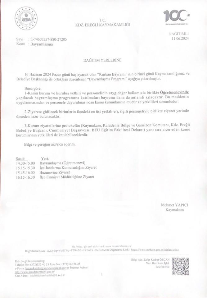 Kdz. Ereğli’de Kurban Bayramı Bayramlaşma programı belli oldu. 16 Haziran Pazar günü 14.30 - 15.00 saatleri arasında Öğretmenevinde yapılacak.