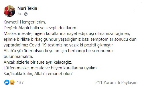 Maske, mesafe, hijyen kurallarına riayet edip, aşı olmamıza rağmen, eşimle birlikte birkaç̧ gündür yasadığımız bazı semptomlar sonucu dün yaptırdığımız Covid-19 testimiz ne yazık ki pozitif çıkmıştır.