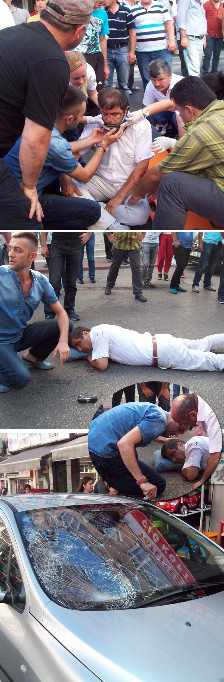 aracın camına vuran ardından yere düşen Belediye Başkanı Sever'e çevredekiler