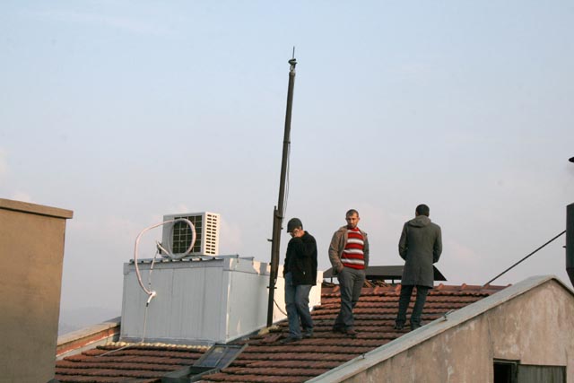 Çatıya çıkan görevliler, GSM operatörünün resmi kuruma ait lojmanın çatısından kaldırılması için çalışmalara başladı.