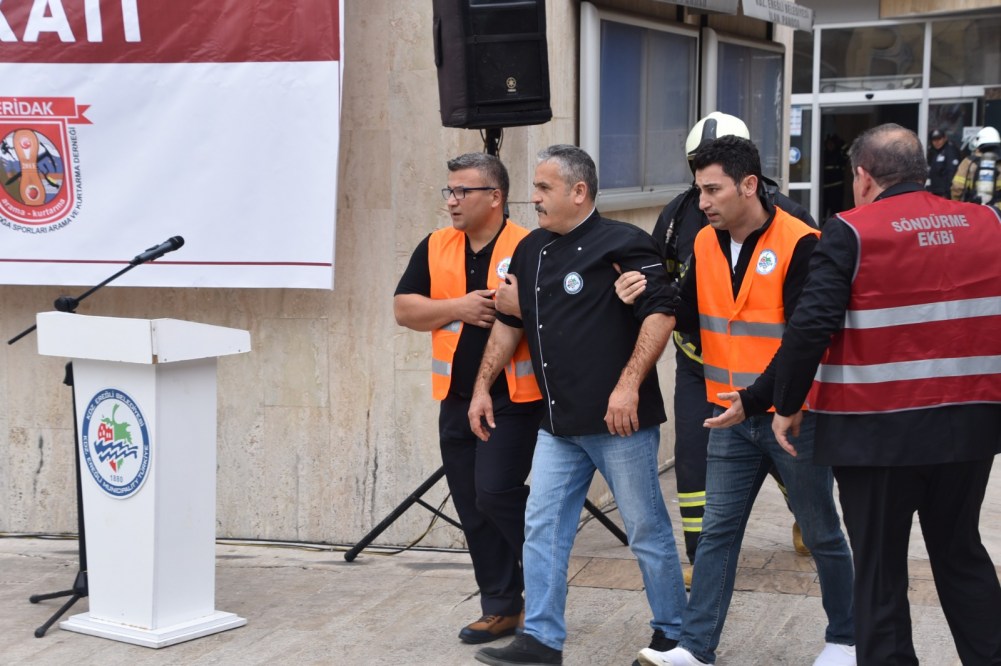 İtfaiye Müdürü Muhammet Ali Ateş’in koordinasyonunda, binada bulunan tüm personel ve vatandaşlar tahliye edildi. Belediye yemekhanesinde çıkan yangın ekipler tarafından söndürüldü ve bina içinde yaralı haldeki 10 vatandaş kurtarılarak sağlık ekiplerine teslim edildi. Yarım saat içerisinde tamamlanan çalışmalar sonrası İtfaiye Müdürü Muhammet Ali Ateş, Başkan Posbıyık’a tatbikatın başarılı bir şekilde sonuçlandığı bildirdi.