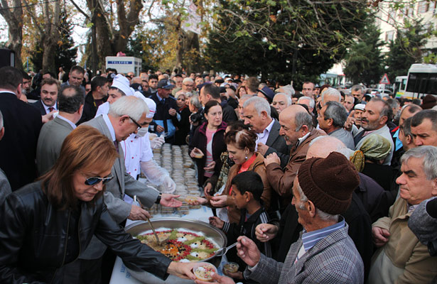 kazanlarda bekleyen aşurelerin dağıtımına geçildi.