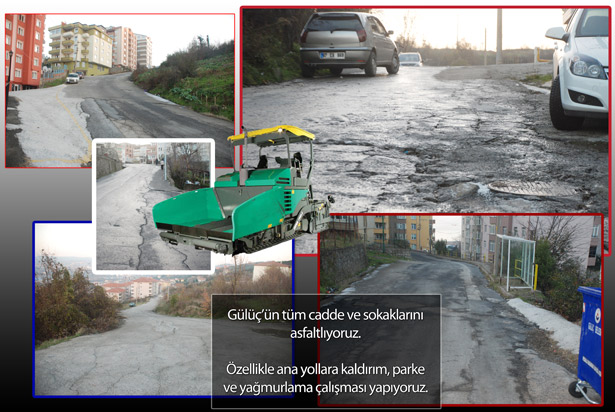 Bu üç büyük projemizin yanında hedefimiz Gülüç'ün bütün cadde ve sokaklarını asfaltlamak ve beldemizde asfaltsız, bozuk yol bırakmamak. Ereğli Belediye Başkanımız Sayın Halil Posbıyık bu konuda zaten bizlere söz vermişti. Seçim büromuzun açılışında bu sözü Gülüç halkına da açıkladı. Bizim halen bazı cadde ve sokaklarımızda kaldırım yok. Vatandaşlarımız yolda yürürken tehlike yaşıyorlar. Kaldırımı olmayan yolların kenarlarına kaldırımlarımızı hemen yapacağız.