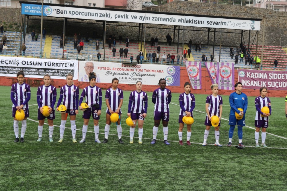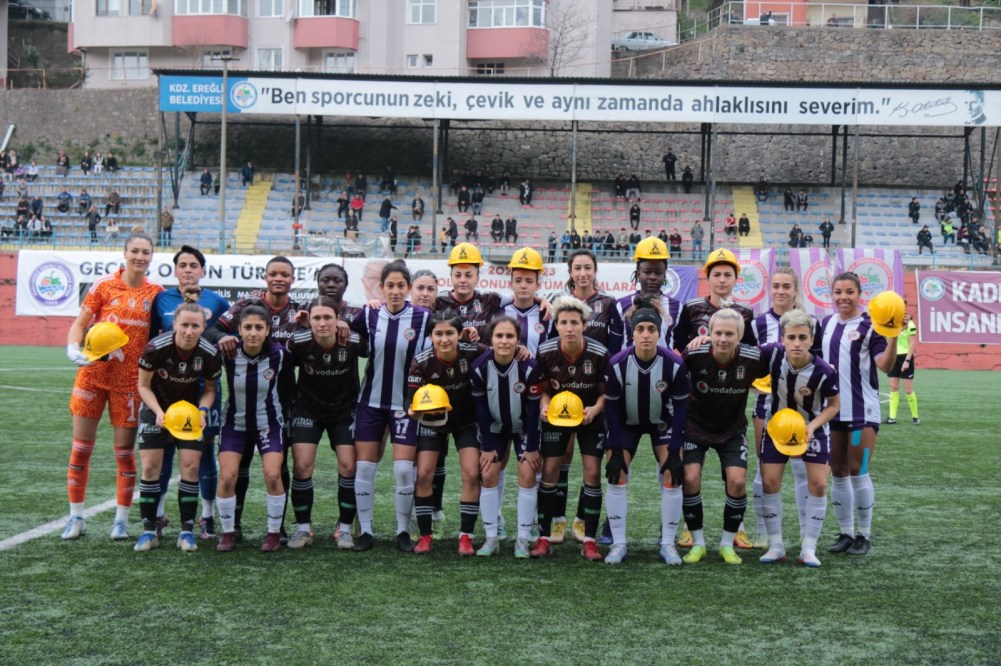 Kadınlar Futbol Süper Lig’de oynanan maçta Ereğli Belediyespor ile Beşiktaş 1-1 berabere kaldı. Ereğli Belediyespor, sahaya üstünde deprem felaketi yaşayan illerin isimleri bulunan baretlerle çıktı.