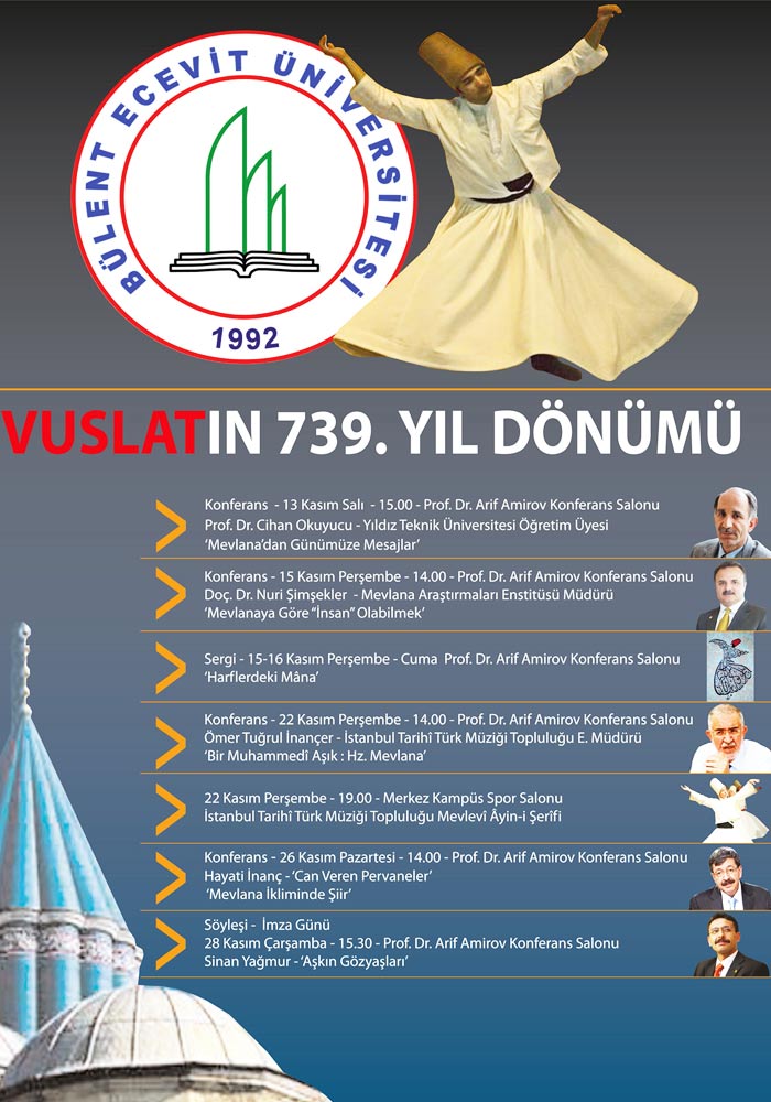BEÜ'den yapılan açıklamada, "Türkiye'de Mevlana ve tasavvuf konularında uzmanlaşmış isimlerin katılımıyla Kasım ayı boyunca düzenlenecek olan etkinliklerle Mevlana'yı anacak olan Bülent Ecevit Üniversitesi, Zonguldak'ı ve Üniversite kampüsünü birbirinden değerli etkinliklerle hareketlendirecek. Ölmek duygusunun kendisi için bir son değil kavuşma olduğunu ifade eden Mevlana Celaleddin-i Rumi ölümü "vuslat" olarak tanımlıyor. Buradan hareketle bu ay içerisinde ilimizde düzenlenecek bu etkinliklere Vuslat'ın 739. Yıl Dönümü programı ismini veren Bülent Ecevit Üniversitesi, ay sonuna kadar yedi ayrı etkinliğe ev sahipliği yapacak. 13 Kasım tarihinde Yıldız Teknik Üniversitesi öğretim üyesi Prof. Dr. Cihan Okuyucu'nun katılımıyla düzenlenecek Mevlana'dan Günümüze Mesajlar isimli konferansla başlayacak Mevlana temalı etkinlikler, 28 Kasım'da satış rekorları kıran Aşkın Gözyaşları kitabının yazarı Sinan Yağmur'un katılacağı bir söyleşiyle son bulacak. Konferanslar, söyleşiler, konserler, sergiler ve imza günleri eşliğinde Mevlana ile dolu bir kasım ayı geçirmeye hazırlanan Bülent Ecevit Üniversitesinde, tam anlamıyla bir tasavvuf atmosferi bu aya hakim olacak. Kültür ve Turizm Bakanlığına bağlı İstanbul Tarihi Türk Müziği Topluluğu'nun 2012 senesinin UNESCO Itri Yılı olması sebebiyle Itri'nin ezgileri eşliğinde gerçekleştirecekleri Segah Mevlevi Ayini, 22 Kasım tarihinde yine Bülent Ecevit Üniversitesinin ev sahipliğinde gerçekleşecek. 22 Kasım tarihindeki bir başka etkinlikte ise ünlü mutasavvıf Ömer Tuğrul İnançer tarafından Bir Muhammedi Aşık: Hz. Mevlana isimli bir konferans düzenlenecek. 15-16 Kasım tarihlerinde bu kez Harflerdeki Mana isimli sergiyi öğrencileriyle buluşturacak olan BEÜ'de, Sergi devam ederken 15 Kasım tarihinde Mevlana Araştırmaları Enstitüsü Müdürü Doç. Dr. Nuri Şimşekler'in katılımıyla Mevlana'ya Göre "İnsan" Olabilmek konferansı düzenlenecek. Kasım ayının 26'sında ise Can Veren Pervaneler TV programının yapımcısı Av. Hayati İnanç'ı konuk edecek olan Bülent Ecevit Üniversitesinde bu kez Mevlana İkliminde Şiir konuşulacak" denildi.