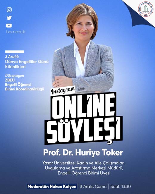 Zonguldak Bülent Ecevit Üniversitesi Engelli Öğrenci Birim Koordinatörü Hakan Kalyon’un moderatörlüğünü yaptığı söyleşinin konuğu Yaşar Üniversitesi İletişim Fakültesi Öğr. Üyesi ve Engelli Öğrenci Birimi üyesi, Kadın ve Aile Çalışmaları Araştırma ve Uygulama Merkezi Müdürü Prof. Dr. Huriye Toker oldu.
