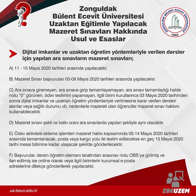 Zonguldak Bülent Ecevit Üniversitesi (BEÜ) uzaktan eğitimle yapılacak mazeret sınavları hakkında usul ve esasları açıkladı.