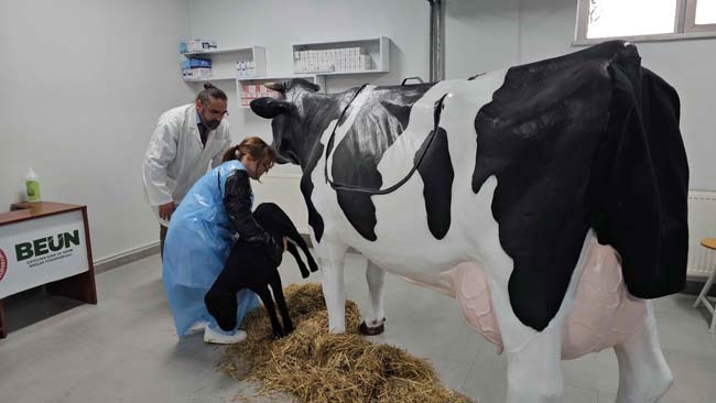Ayrıca, fonksiyonel doğum kanalına sahip olan inek doğum simülatörleriyle güç doğum senaryoları, doğum kanalının muayenesi, doğuma yardım yöntemleri ve doğum sonrası buzağı bakımı uygulamaları da gerçeğe yakın şekilde deneyimlenebiliyor.